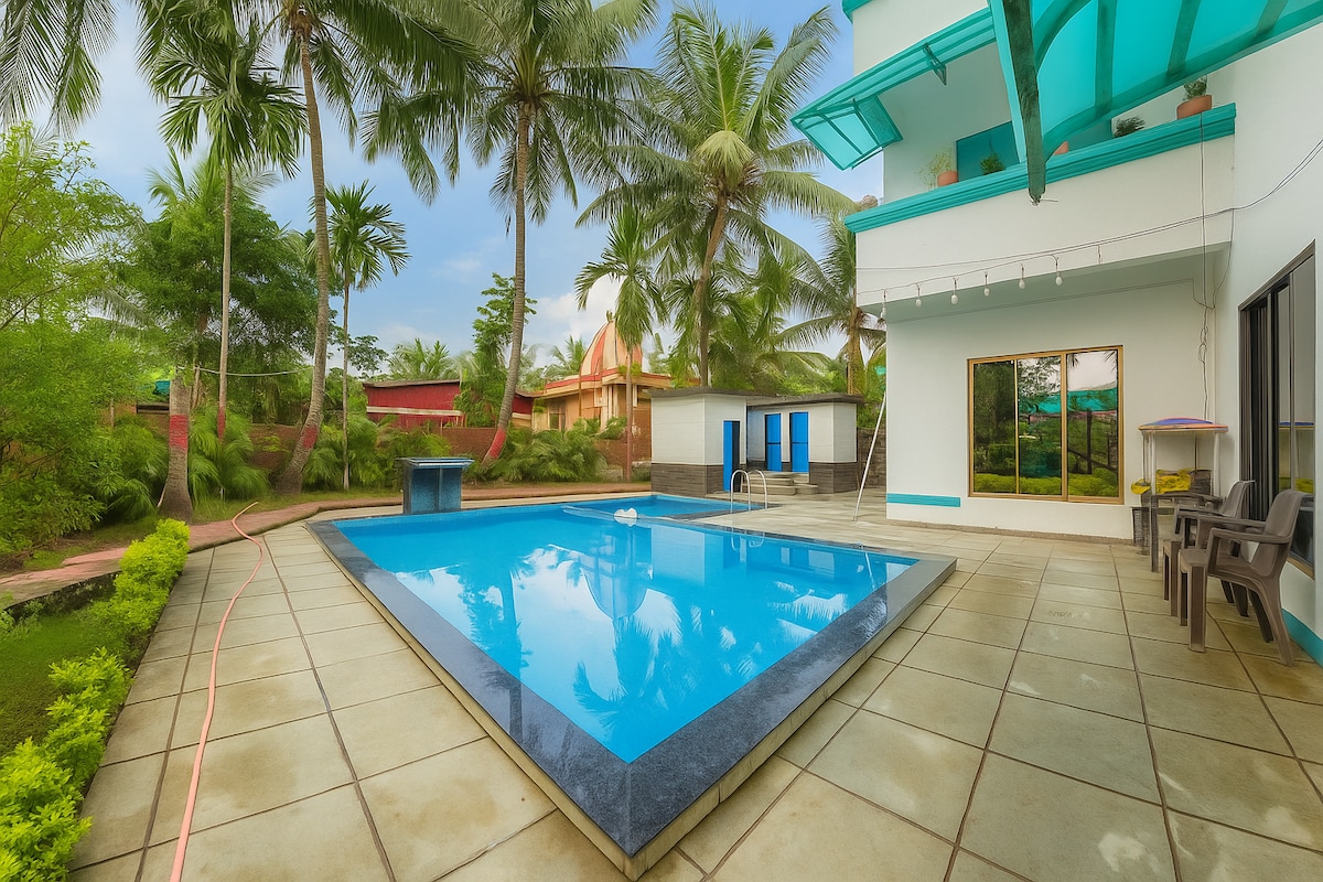 😍 Вілла 4bhk з приватним басейном 📍 Alibag 🏡Зручності: -Приватний басейн; -4 розкішні номери з кондиціонером - Просторий зал -Телевізор -обідній стіл; - Холодильник ¥Gyser у кожній ванній кімнаті - ігри в приміщенні - підключеннядо Wi-Fi; - Доступний додатковий матрац - Зулана відкритому повітрі -2-3 години для резервного копіювання інвертора - налаштування барбекю ⏩Їжа за додаткову плату (гостям не дозволено користуватися кухнею) - 3 ванні кімнати, 1 на відкритому повітрі ⏩Доглядач 24/7