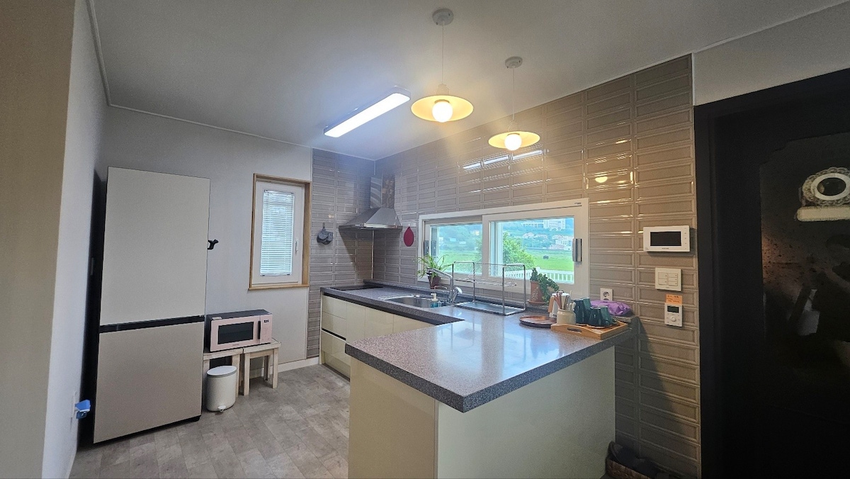 Кімната Haeoreum, розташована між німецьким селищем та невеликим пагорбом, має фантастичний вид на море. Він розташований на пагорбі села, звідки відкривається вид на море Намхе, яке розкинулося, як складана ширма. За 5 хвилин пішки можна дійти до гарного пляжу Еунджеп Монгдол. Це затишне і красиве рибальське селище. 2 хвилини на автомобілі від німецького селища (10 хвилин пішки до входу в «Німецьке містечко») і Розташована в центрі східного узбережжя Намхе Він також розташований у привабливому місці з доступом до сусідніх туристичних пам’яток, таких як Садово-городнє мистецьке село, природний рекреаційний ліс Пхьонбек, прибережна обсерваторія Мулмі, Сілліський небесний міст і пляж Санджу Еунсоль. Сад на даху площею 30 квадратних метрів із чудовим видом на океан, як ваш власний простір, Смачне барбекю на вугіллі в цілому окремому помешканні на 2-му поверсі~!! Ми ретельно готуємо його зі смачною маринованою редькою, вирощеними листковими овочами та гарним вугіллям. Протягом дня, дивлячись на блакитне море, що сяє сріблом Спостерігайте за зірками, що сяють уночі Зробімо чудові спогади в Намхе~^^ Для комфортного нічного сну Це окрема студія з ліжком розміру «queen size» у кожній кімнаті та вітальні.