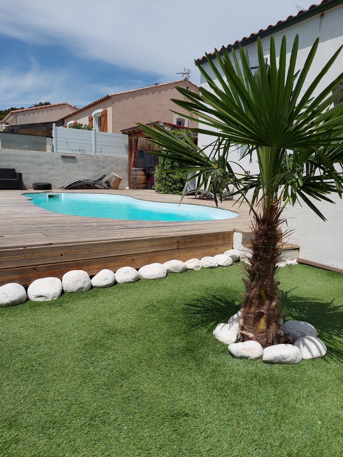 Тихо розташоване в сільській місцевості за 2 хвилини від Нарбонни та в 10 хвилинах від пляжів, насолоджуйтеся чарівною обстановкою цього романтичного помешкання площею 20 м2 у великому закритому та безпечному саду площею 2000 м2 з басейном з підігрівом з травня по жовтень, будинком з басейном, тренажерним залом, барбекю, полем для петанк тощо. Сад і басейн є спільними для наших трьох інших невеликих заміських будинків. Casèl повністю обладнаний 160 ліжками, кондиціонером, обладнаною кухнею, Інтернетом і телевізором, великою терасою з планомча.