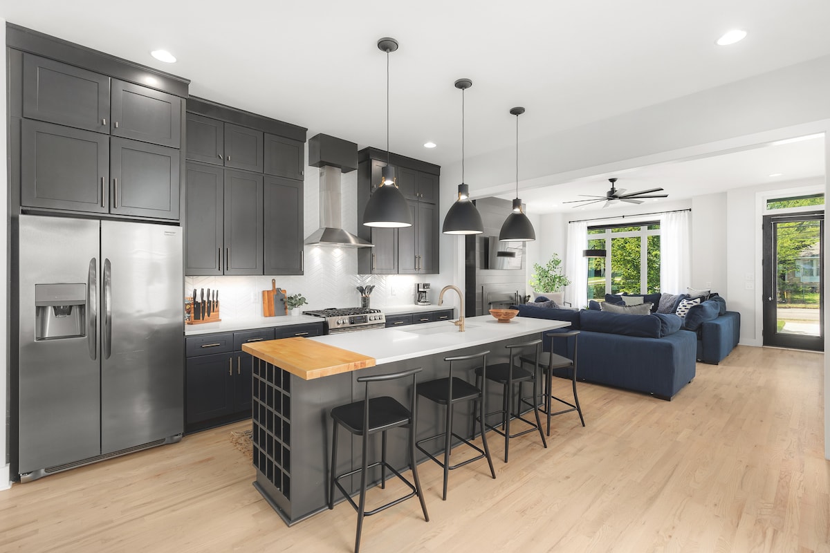 Сучасна розкіш у центрі Східного Нешвілла. ВЕЛИЧЕЗНА тераса на даху з вуличними меблями, а також великий задній двір і патіо з додатковими сидіннями. Усе помешкання у вашому розпорядженні - 10 спальних місць із 6 ліжками, 3 спальнями та 2,5 ванними кімнатами. Розташоване в модному парку Клівленда з сусідніми ресторанами та кав 'ярнями. Всього в 10 хвилинах від Бродвейських барів у центрі міста або за 13 хвилин до Опрі. Пральна/сушильна машина в помешканні, газовий гриль плюс БЕЗКОШТОВНА вулична парковка. Насолоджуйтеся відпочинком у цьому прекрасному помешканні після дня прогулянки.
