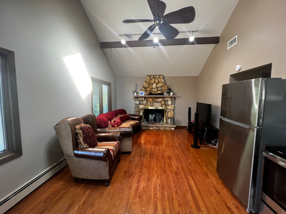 Простір розташований на рівні землі, його площа становить близько 600 квадратних футів. Найкраща його частина розташована поруч із підземним басейном. Басейн завглибшки 4-7 футів з лаунж-зоною. На першому поверсі розташована нещодавно відремонтована кухня (без духовки) на 6-7 місць, невеликий обідній стіл, телевізор з плоским екраном, секційний диван і повна ванна кімната. Спальня на нижньому рівні - близько 600 кв. футів. У спальні ви знайдете два ліжка з піною для пам 'яті розміром Queen size з верхньою частиною лінійної білизни. Ми дозволяємо утримувати домашніх тварин зі збором за домашніх тварин у розмірі 75 дол. США.