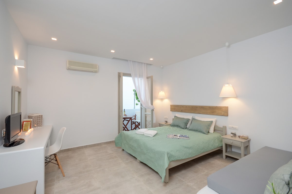 Наш новий люкс повністю відремонтований відповідно до кікладського стилю з дивовижним кікладським декором! До послуг гостей двоспальне ліжко, а також можливе третє зручне ліжко. Люкс із кондиціонером, безкоштовним Wi-Fi, телевізором із плоским екраном, нещодавно ванною кімнатою з готельними зручностями, повністю обладнаною кухнею та окремим мебльованим балконом з унікальним видом на пляж Айя-Анна! У цій кімнаті можуть розміститися 2-3 особи!Він розташований ВСЬОГО в 10 метрах від пляжу.