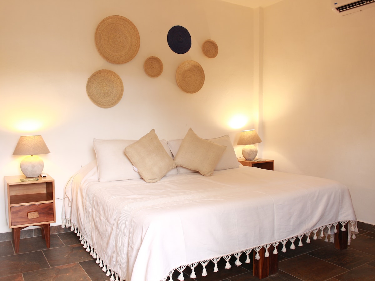 Bienvenido a Casa TATEI, tu refugio en la selva. La habitación Mar invita a la profundidad. Con luz de amanecer y vistas que conectan con lo inmenso, esta habitación con cama king ofrece calma. El aire acondicionado y el colchón terapéutico acompañan el descanso como a flotar en suavidad.