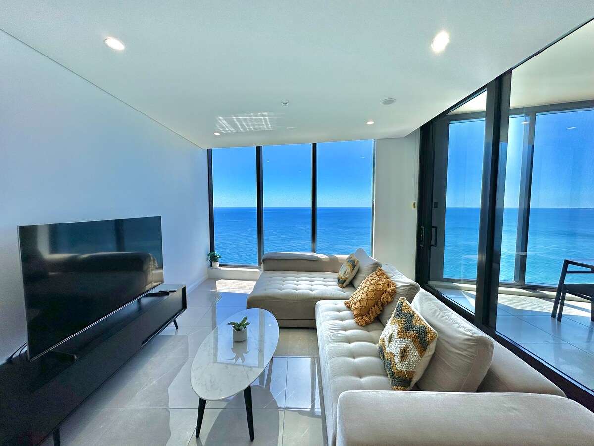 Direct ocean and city views from this brand new luxury 2-bedroom, 2-bathroom corner apartment. You will be high in the sky on level 55+. The unit is complete with FREE PARKING in the buildings gated underground car park. Absolute beachfront location at the newest building in central Surfers Paradise. The unit is equipped with everything you will need for your stay including fast 5G WiFi and more! Enjoy the heated outdoor pool, spa, grass/picnic areas, gym, cafe, and restaurants.