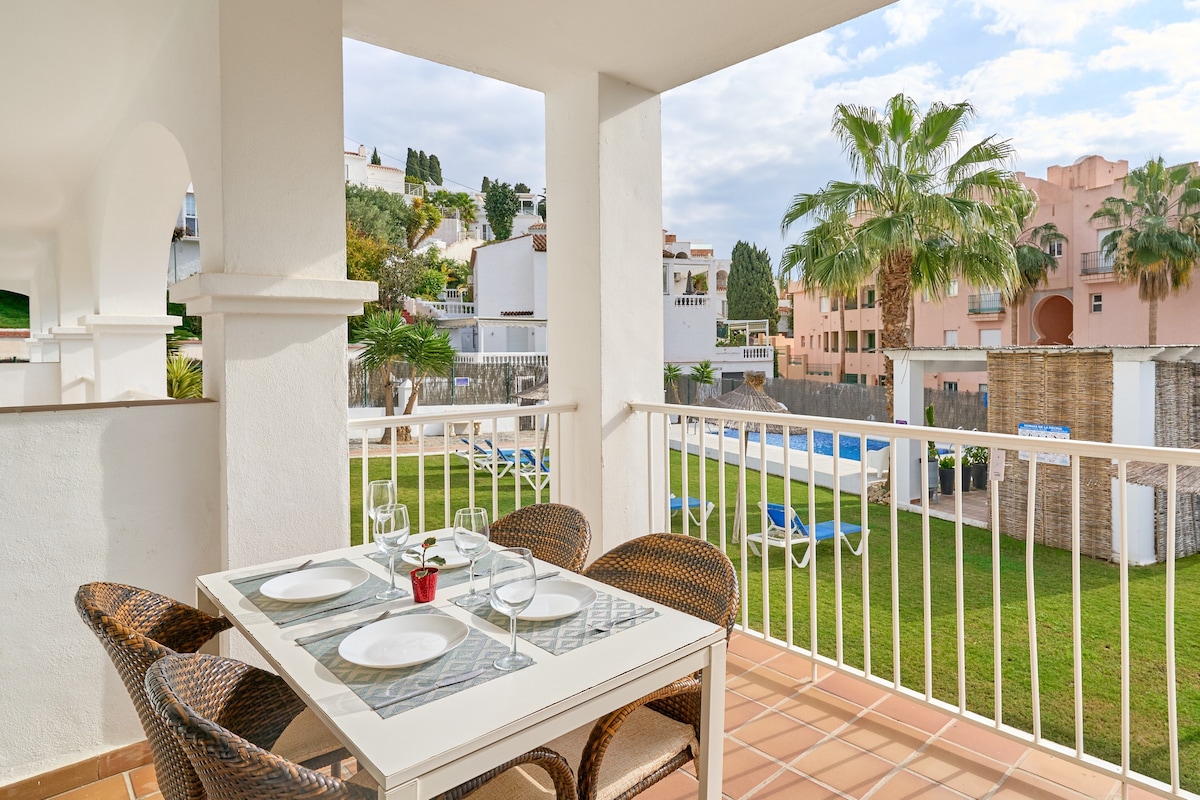 The N9 apartment in Nerja offers 50 m² for up to 5 guests. Enjoy a living room, two bedrooms, and a bathroom. You have a fully equipped private kitchen, air conditioning, Wi-Fi, TV, and a workspace. Private amenities include a balcony, covered terrace, and jacuzzi. Beach towels, cot, and high chair are available for an extra fee. Daily cleaning is included and parking is available for an extra fee. Please note the pool is closed in November, December, and January.