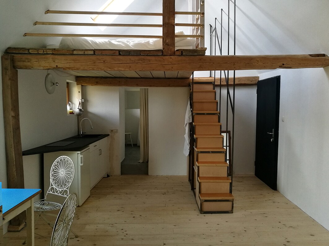 Йога, медитація, дихальні вправи та рейкі між городом, мистецтвом і дизайном. Пропонується гарна, тиха квартира з окремим входом і видом на сад. Кімната площею 32 кв. м із стелями висотою 4 м обладнана зручним ліжком на антресолях, кушеткою, глиняною стіною, дерев’яною піччю, ванною кімнатою з душем та невеликою кухнею. Якщо ви хочете зайнятися йогою з нами, пройти уроки йоги та/або взяти сеанси Рейкі, зв 'яжіться зі мною.