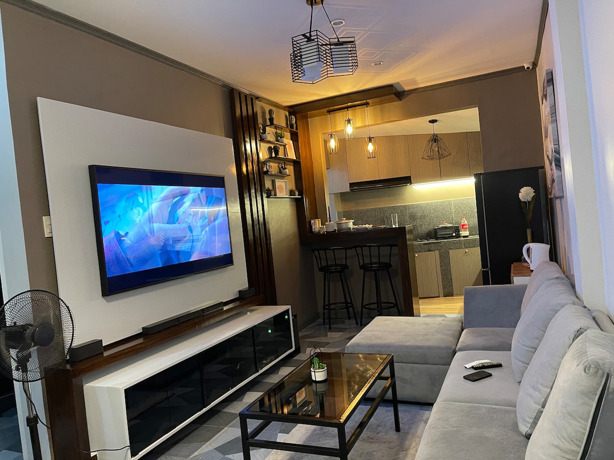 Це простора квартира-студія в задній частині торгового центру Abreeza, розташованого в центрі міста Давао. Двоє гостей можуть комфортно перебувати. Можуть бути додані ще двоє гостей, які готові спати в шкіряному відкидному куточку або ліжку-футон. У студії є міні-кухня з холодильником, рисоварна плита з відпарювачем, тостер для духовки та повний обідній посуд. У помешканні можна безкоштовно користуватися прасками для прасування.