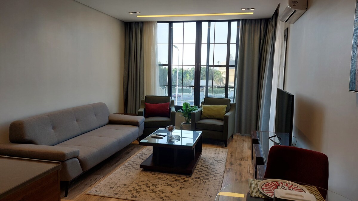 Welcome to our stylish 1-bedroom apartment: Message us for seasonal & special discounts. ●Bedroom (Queen size + sofa bed) ●Living room (smart tv + Couch) ●Dining area for 3 ●Sleek bathroom ●Fully equipped Kitchenette Located in the heart of the city, you'll be moments away from trendy cafés, vibrant nightlife, and top dining spots. ●WaterWay 5A, ●District 5 Marakez ●Uavenues ●The drive ●Katameya ●Garden 8 ●El Malahy ●CFC ●Arabella & many other venues. Contact us for more recommendations.