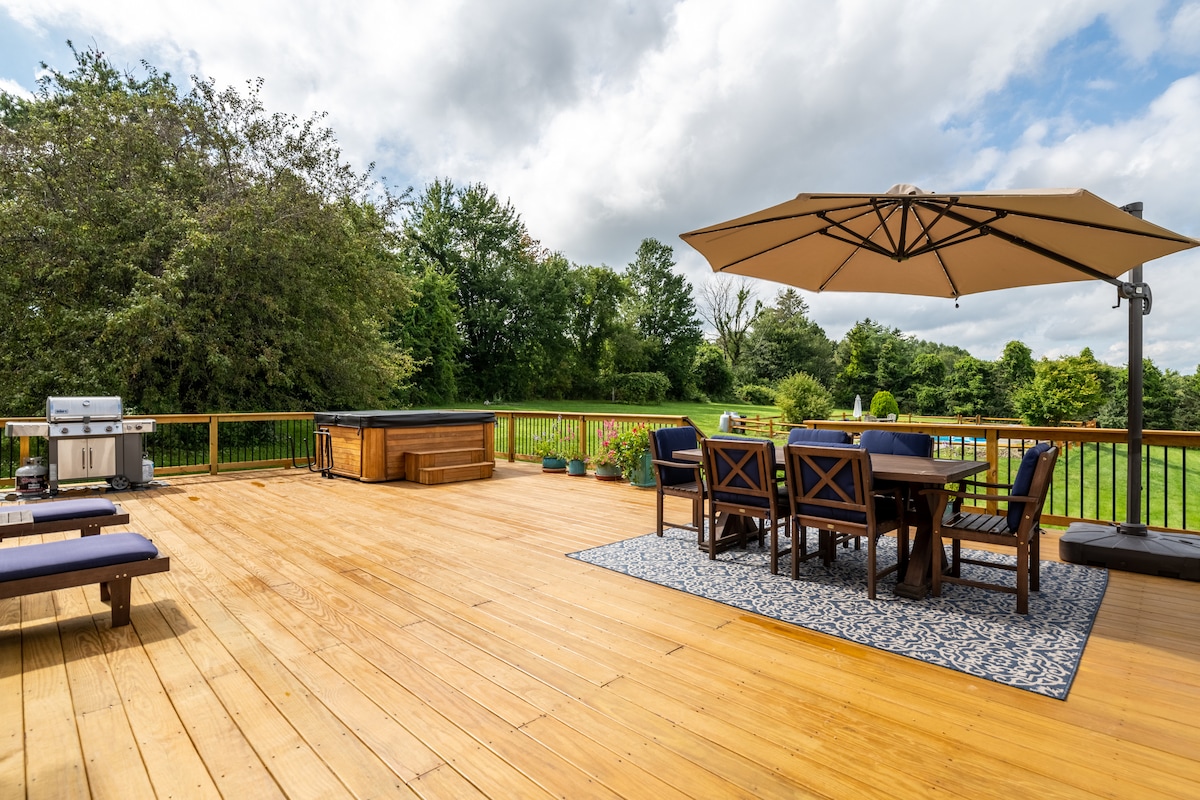 This is a fully renovated house situated on 14 acres in Litchfield County, CT. This is a 5 bedroom estate - 1 king size bed, 3 queen beds, 1 bedroom is a dedicated office with a queen size air mattress. 2 full bath/2 half bath, 8 guests maximum. Saltwater pool, 5 seater/1 lounger hot tub, outdoor dining area, 6 seater fire pit, 8 seater table in dining room, 4 seater breakfast table in kitchen, exlarge jacuzzi in primary bathroom, wood burning fireplace in living room. Completely private