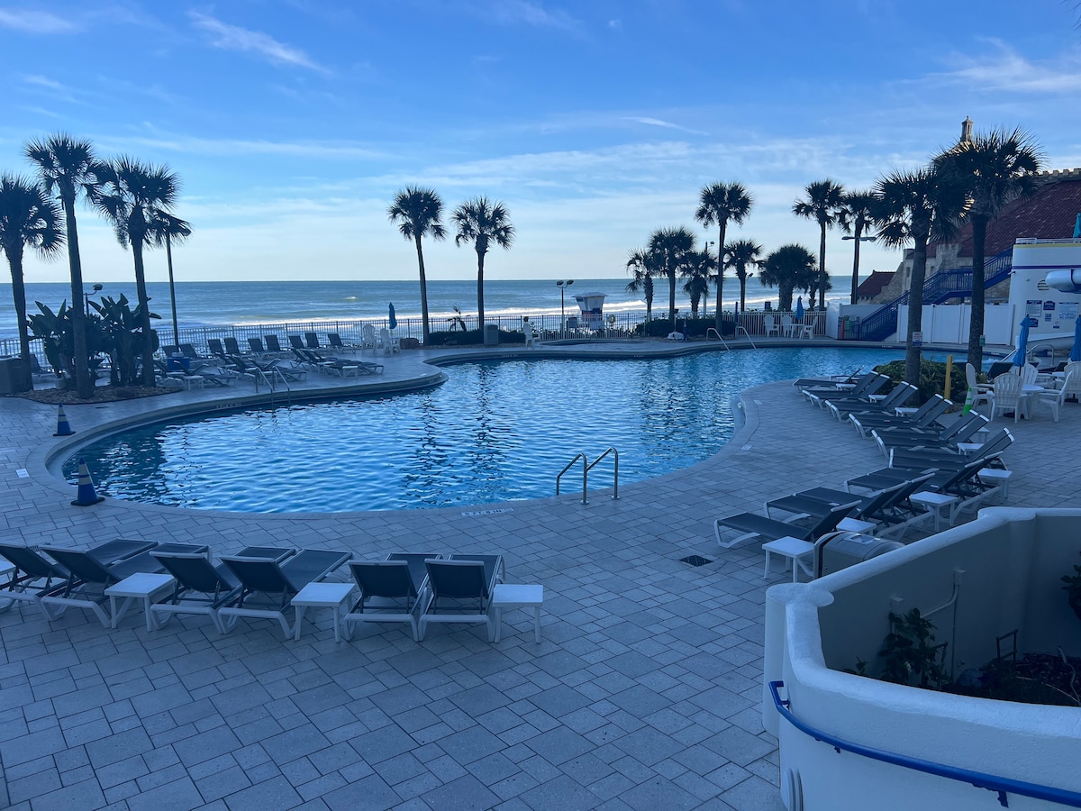 We are located on Daytona Beach a 1 minute walk through the pool area to be on the beach POOL IS OPEN AND INDOOR POOL IS OPEN Kick back and relax in our newly remodeled calm and stylish space. we have a full size refrigerator, you will fall in love with our balcony views. we have all pots and pans and kitchen supplies. all linens and beach towels included. we have 1 king bed and a futon couch big enough for 1 adult or 2 small children.
