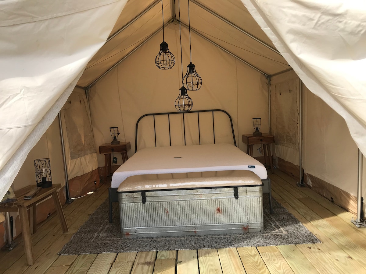 Відвідайте автономну розкішну глемпінгову пригоду в центрі Гудзонської долини, відкрийте для себе один із приватних островів Твін-Айленд-Лейк з видом на 360 градусів. Відновіть зв 'язок із собою та природою в наметі в стилі сафарі з ліжком розміру Queen size. Альтанка розміром 13x10 з зручностями на відкритому повітрі. Припаркуйтеся на материку поруч із причалом, де вас чекає каное. Ця солодка втеча - унікальне враження, яке ви запам 'ятаєте назавжди.