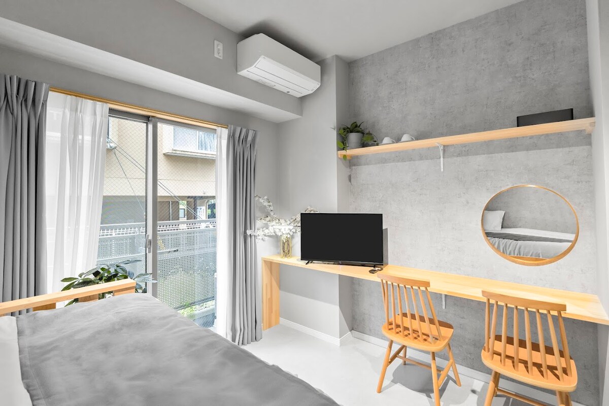 Кімната обладнана стильним декором, зручною постільною білизною (матраци Simmons) та функціональним робочим місцем. Кімната площею 307 квадратних футів має окремий туалет і ванну кімнату. Він пропонує готельні зручності та повний спектр кухонного приладдя для вашої зручності. Доступні ☆ довготермінові бронювання! ☆ Найближча станція: станція Роппонгі Всього в 3–4 милях ходьби від вокзалу ☆ Найближча автобусна зупинка: перед театром EX Прямий автобус до Сібуї, лише 15 хвилин
