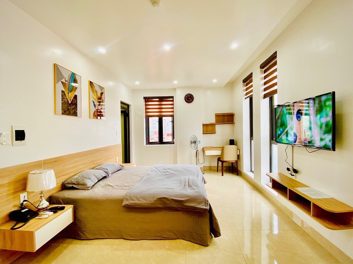 Ця будівля розташована на вулиці Ван Цао, на одній з цікавих вулиць. Тут так багато видів ресторанів, таких як корейський ресторан, японський ресторан, сінгапурський ресторан і кав 'ярня, як-от Starbuck, кава Highland. У нашій кімнаті настільки велика, що в ній є повне обладнання, таке як пральна машина, мікрохвильова піч. Ми щодня надаємо прибирання, високошвидкісний Wi-Fi. Наша стійка реєстрації також говорить англійською. Клієнт буде задоволений нашим продуктом, який буде комфортно з нашим сервісом. У нас також є сауна та тренажерний зал.