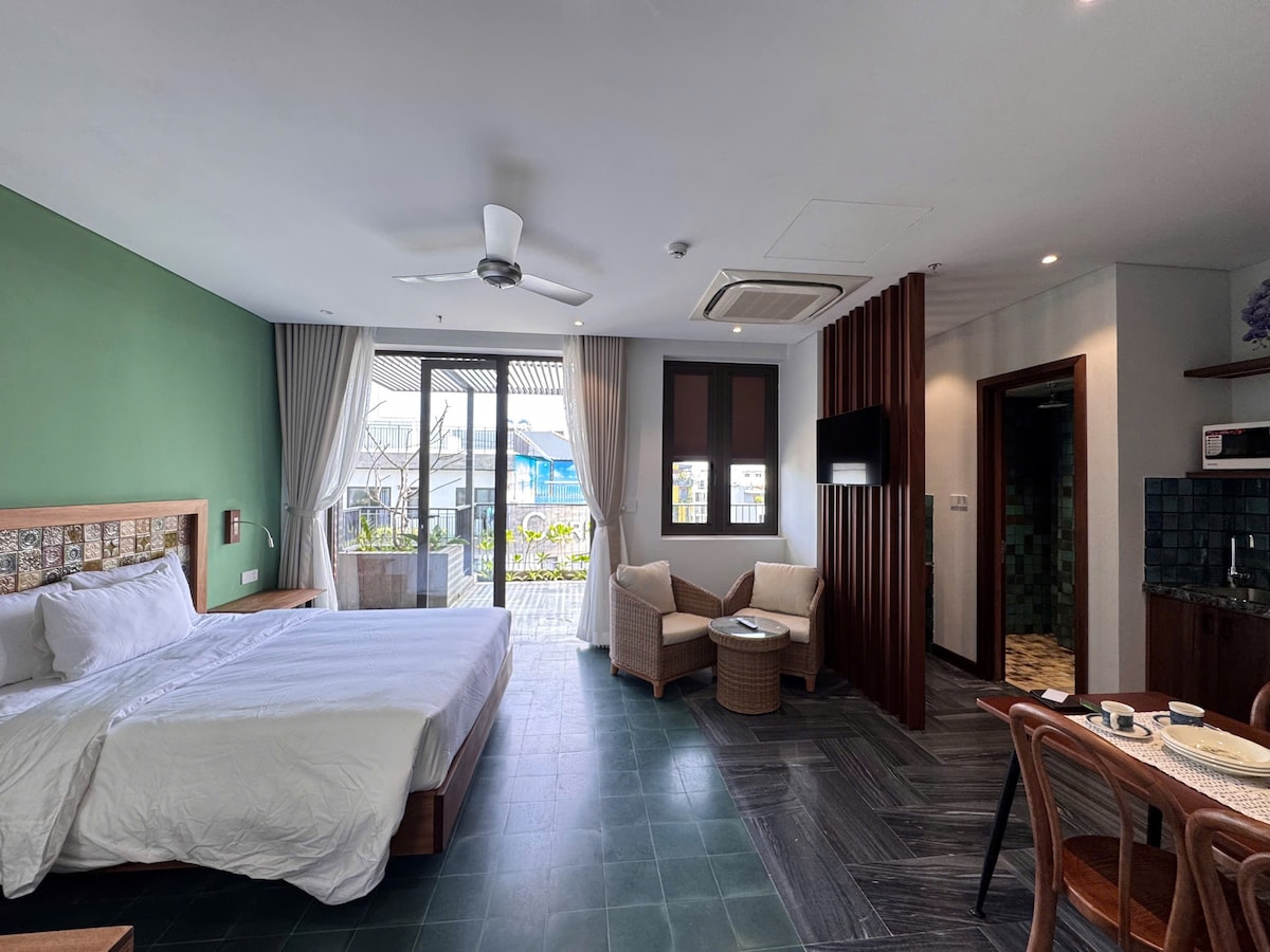 Апартаменти-студія Deluxe з 2 ліжками, розраховані на 3 дорослих (2 дітей до 6 років безкоштовно), з міні-кухнею, Smart TV (місцеве телебачення плюс Netflix/You Tube/Інтернет), диваном, обіднім столом та 4 стільцями, високим холодильником, ванною кімнатою (душем). У всіх номерах відкривається чудовий вид на Східне В 'єтнамське море, а з деяких з них також відкривається вид на Мармурові гори, місцеве поле для гольфу Co River. З усіх кімнат відкривається панорамний краєвид, який не перешкоджає сусіднім будівлям.