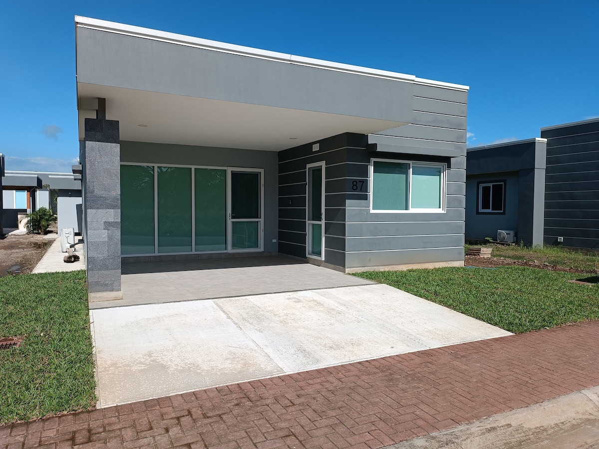 Маленькі бунгало нового типу лофт 1 км від Плайя-Негра. Приватний і повністю обладнаний для комфортної подорожі. Ми знаходимося в привілейованому місці недалеко від найкрасивіших пляжів, таких як Авельянас, Хункільяль та Плайя-Негра (2 хвилини на автомобілі), одні з найкращих хвиль у Коста-Риці. Також неподалік від ресторанів та мінімаркетів. Вона має високошвидкісний Wi-Fi, кондиціонер, обладнану кухню, ліжко queen-size, окрему ванну кімнату з гарячою водою та власну терасу. Спільний басейн