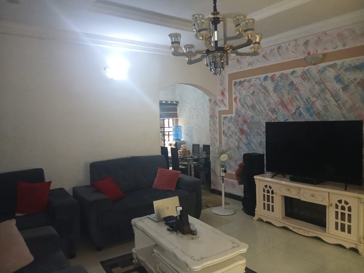 Nestled in a prime location, CasaGialo is a private 2bedroom duplex house , in self compound Gated with own clean water supply,mosquito nets, fully air conditioned , a Garden , balcony and patio . You will have access to all utilities in the house including 2 bedrooms with each ensuite , 2 livingrooms /game room , fully fitted kitchen, laundry area, 3 toilets and 2 baths . 💯 privacy is guaranteed. You will have 24 hrs electricity,air-conditioning CCTV, and has been seasonally fumigated .