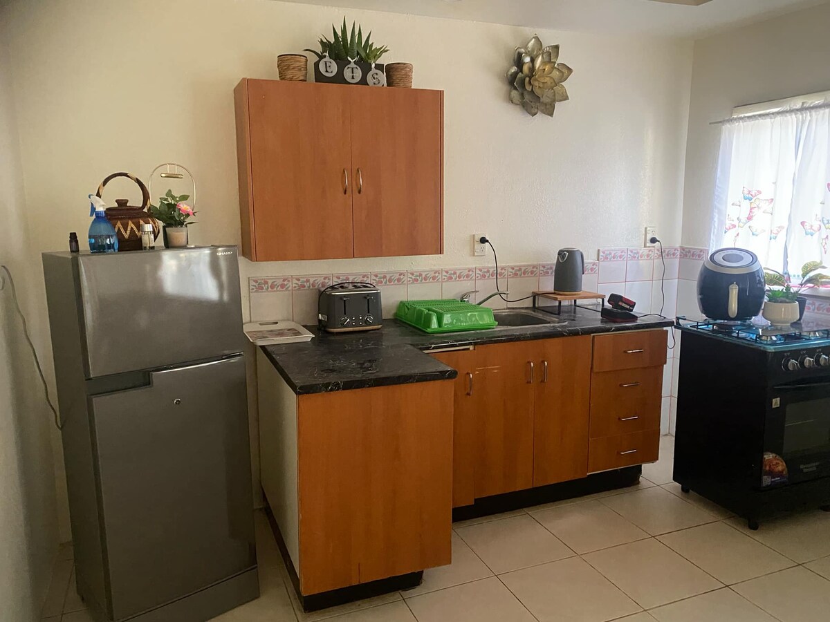 Your Home Away from Home – Spacious 4-bedrm with 3 full bathrooms with a formal lounge, TV room (Smart TV + Netflix), and large dining area. AC in each of the 2 En-suite bedrooms Cooling FANS in all remaining rooms. FREE unlimited WiFi. Enjoy a fully equipped kitchen with a stove, microwave, fridge, and essentials. Newly renovated bathrooms with hot water. Laundry room with washer, iron, and indoor/outdoor clotheslines. Gated property with Outdoor security camera.