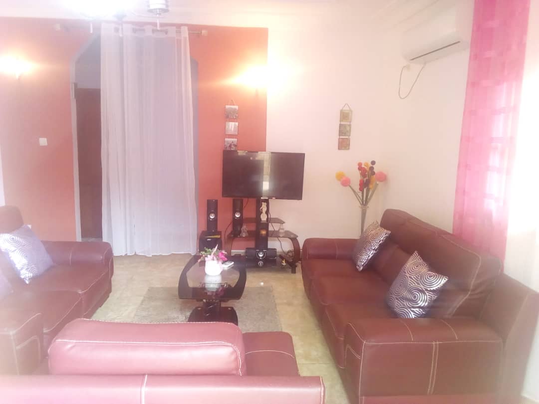 L'immeuble se trouve au quartier kotto baden baden entre la mairie Kotto village et fin goudron Bangué à 10 mn de la rue principale.Quartier résidentiel tranquille.Au vue de la présence de 3 clim, l'électricité est à payer en plus. L'appartement est au 1° étage. La climatisation est présente dans les 2 chambres et le salon.La cuisine est équipée d'un frigo, une cuisinière et un four à micro onde.... Il y a un forage avec pompe pour l'eau.