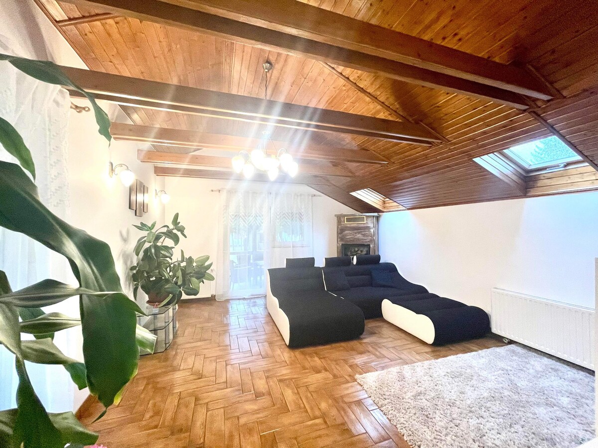 Чарівний маленький дерев 'яний котедж з невеликим садом, у п' яти хвилинах ходьби від озера Банк (60 кілометрів від Будапешта). У саду є барбекю, трамбулін та невеликий ігровий дім для дітей. Будинок має одну спальню (дитячукімнату), вітальню з двоспальним ліжком та повністю обладнану кухню (посудомийна машина, мікрохвильова печь, холодильник, духовка, електрична плита, кофемашина nespresso) та ванну кімнату з ванною та туалетом. На терасі розташований стіл зі стільцями.