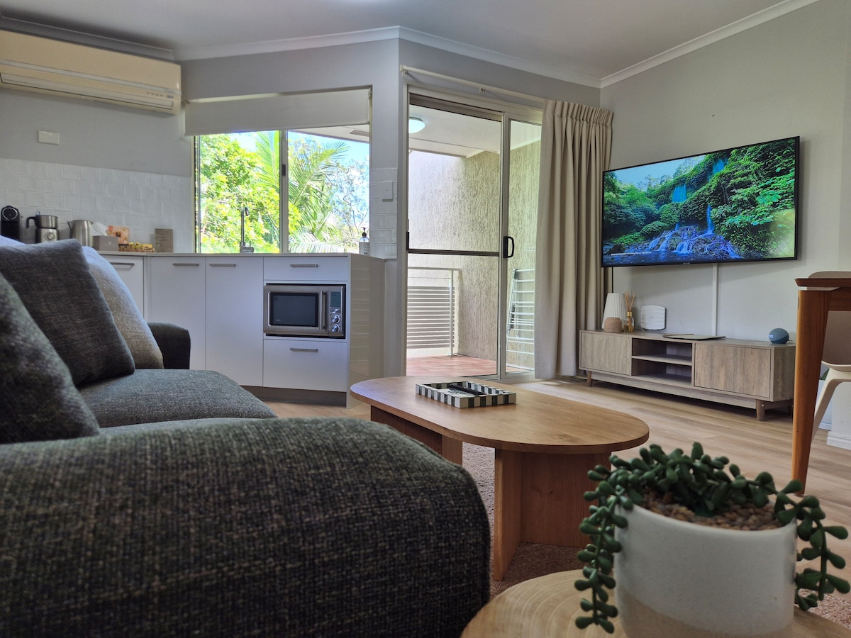 Modern stylish Large Studio appartment 600m up from Hastings Street and main Beach This private appartment is on the ground floor with Lovely courtyard area with access to a smaller pool off the main resort Pool. it has a yoga center, cafe, undercoverparking, E charger for car, bus stop out front. It is minutes walk from the IGA and has a BWS directly across the road. Hastings Street and fabulous restaurants of the Junction are equal distance either side
