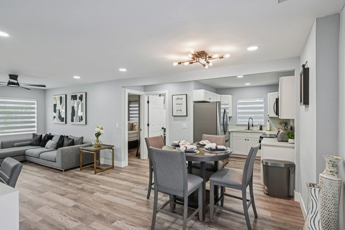 Це найкращий відпочинок для наших гостей. Так... у вас буде цілий будинок для себе . Ви можете насолоджуватися двома спальнями / 2 ванними кімнатами з кімнатою у Флориді, а також патіо на вулиці з альтанкою(барбекю) та великим заднім двором. Наш нещодавно відремонтований притулок знаходиться в ідеальному місці, недалеко від пляжу, поблизу всіх найкращих ресторанів, і має всі зручності, необхідні для легкого сімейного відпочинку. Безкоштовна зарядка електромобіля L2 у гаражі! Плата за прибирання становить лише 49 $.