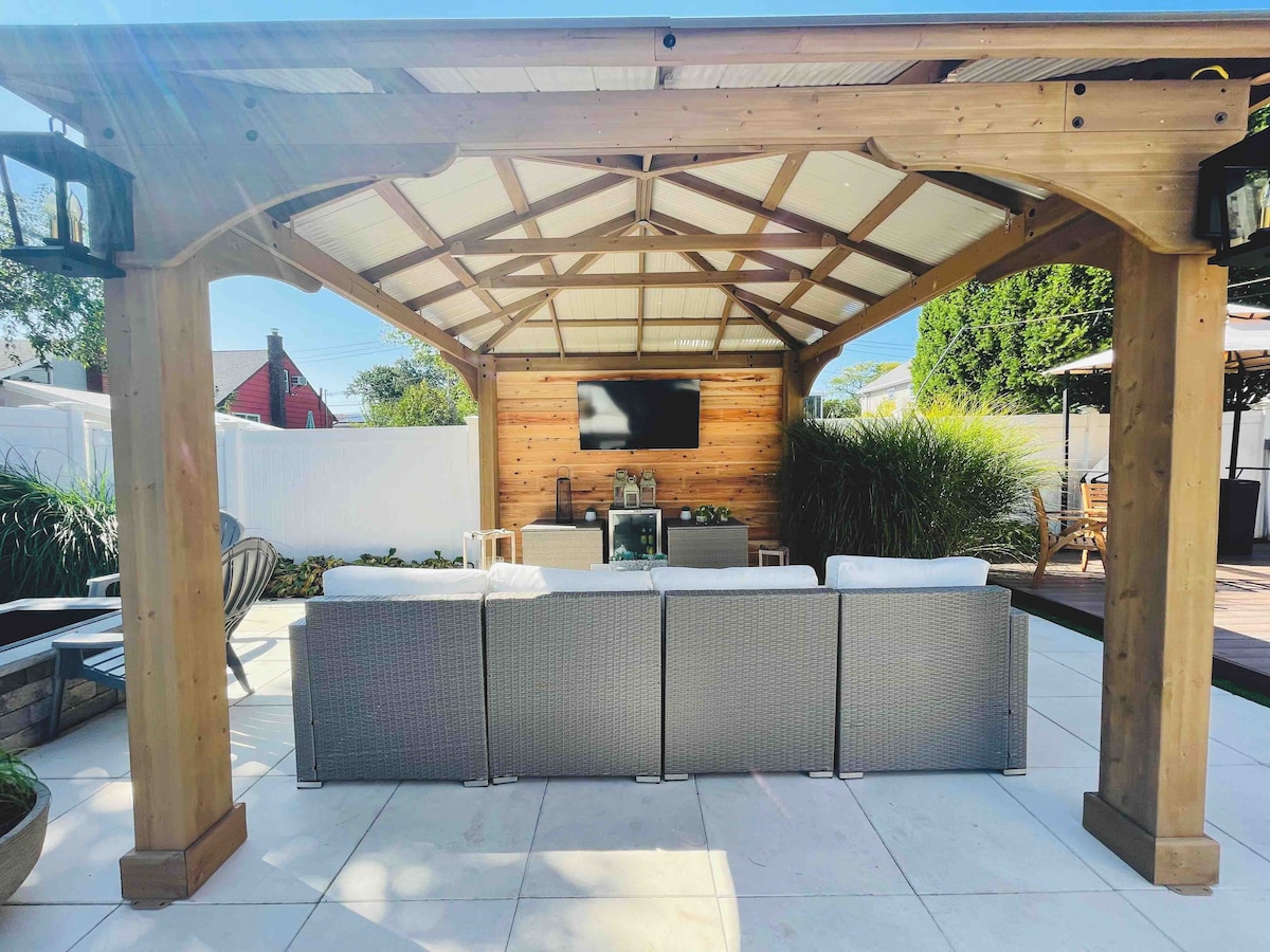 The space is on the ground level its about 600 square feet. Best part is its right next to the inground pool. The pool is 4-7 feet deep with a lounge area. On the ground floor we have a newly renovated kitchen (no oven), seating for 6-7 people, small dinner table, Flatscreen TV, Sectional sofa, and full bathroom. The bedroom in the lower level is about 600 sqft. In the bedroom you will find two queen size Memory Foam beds with top of the line linens. We do allow pets with a $75 pet fee.