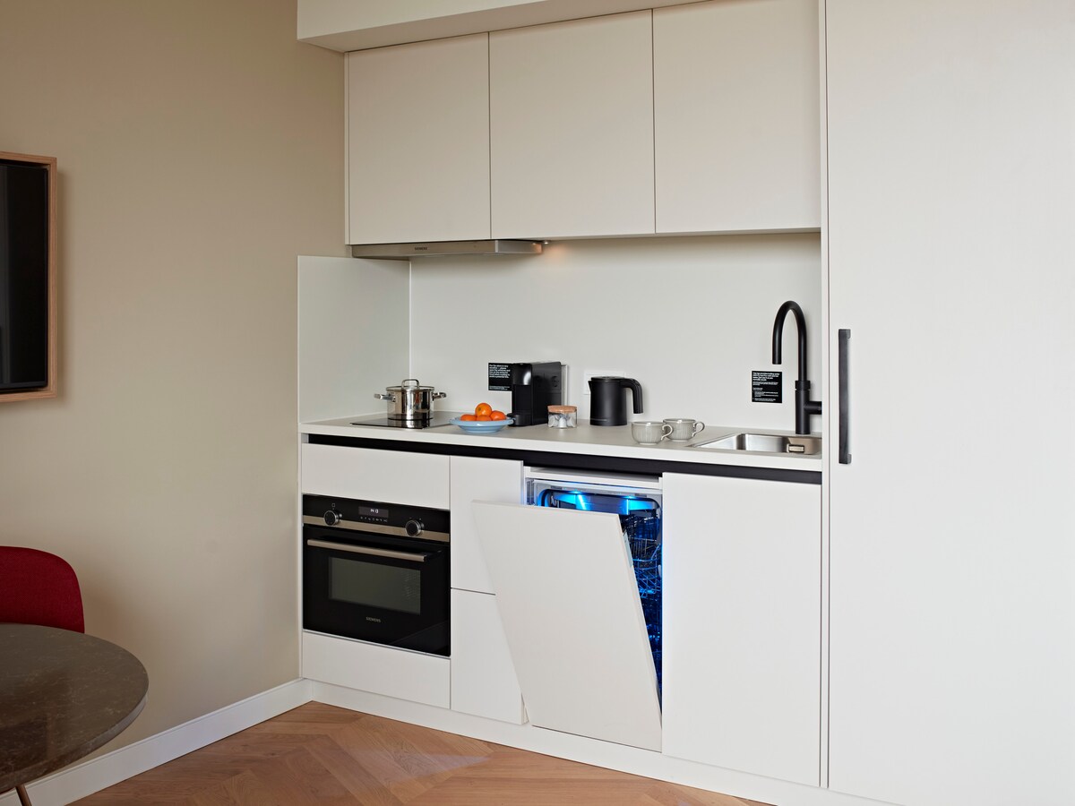 Простора, стильна студія для друзів і сім’ї, яка може вмістити до 4 гостей. Ліжко розміру Queen size та диван-ліжко для комфортного сну. Кухня з холодильником, плитою, мікрохвильовою піччю/духовкою, посудомийною машиною та кавоваркою Nespresso. Вітальня та обідня зона з диваном, телевізором, безкоштовним Wi-Fi та робочим місцем. Сучасна ванна кімната з тропічним душем, туалетними приналежностями та феном. У квартирі є система клімат-контролю.