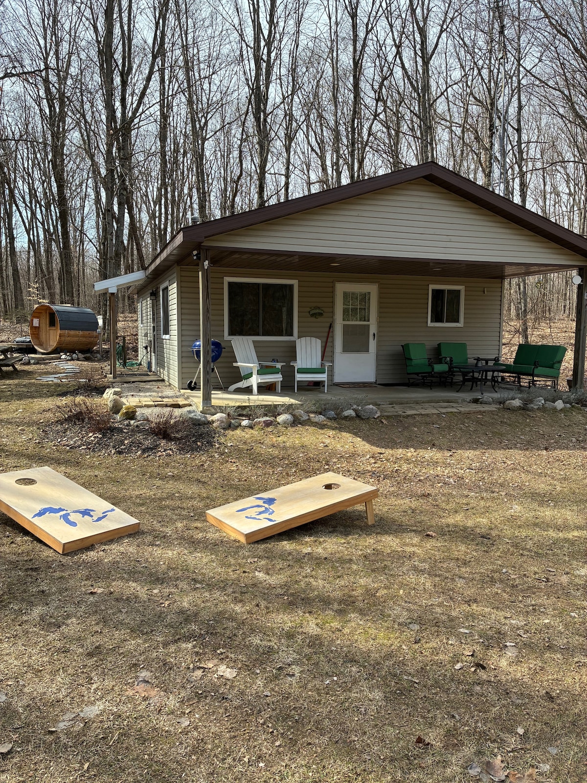 Затишний, затишний зруб у спокійному оточенні, всього в декількох хвилинах ходьби або на машині, через дорогу до озера Мічиган. До послуг гостей кухня з асортиментом, мікрохвильовою піччю, кавником, посудом тощо. Головна спальня внизу, з відкритим лофтом на верхньому поверсі та прихованим ліжком у вітальні. Критий ганок для відпочинку, дощу або блиску. Багато місцевих пам 'яток, таких як піщані дюни Срібного озера, Стоуні-Лейк, численні поля для гольфу поблизу, риболовля, плавання та місцеві фермерські ринки. Ідеально підходить для сімей або пар.