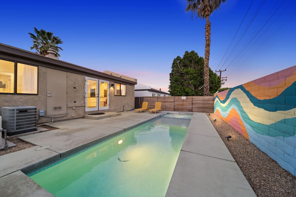 Сучасна атмосфера середини століття з басейном і спа на задньому дворі