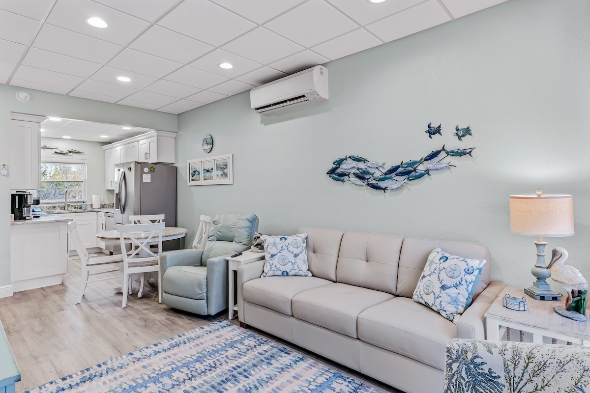 Ласкаво просимо до нещодавно відремонтованої квартири в центрі Трежер-Айленду. Цей яскравий і сучасний затишний куточок ідеально підходить для відпочинку в усамітненні. Ідеальне місце для любителів пляжу та спостерігачів за дикою природою з видом на набережну каналу з вікон вітальні, кухні та спальні та прекрасними заходами сонця. Всього в 2 кварталах або 5 хвилинах ходьби від красивого білого піщаного пляжу та в декількох футах від каналу та басейну. Відвідайте чудові ресторани поблизу, прогуляйтеся дощаним настилом John's Pass Boardwalk і послухайте живу музику.