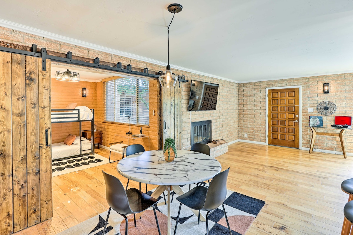 Відпочиньте в нашому яскравому, чарівному бунгало в Скоттсдейлі – вашому приватному оазисі в пустелі, за кілька хвилин від Старого міста Скоттсдейла та Мілл-авеню Відпочиньте в глибокому ретро-басейні (прохолодному та освіжаючому) або зануртеся в гідромасажну ванну на 5 осіб під зірками. Гриль на критому відкритому патіо. Вам сподобається всередині: М’яке двоспальне ліжко + 7,6 см матрац, бавовняна білизна, пухові ковдри Pottery Barn Wi-Fi зі швидкістю 500 Мбіт/с – чудовий варіант для віддаленої роботи в приміщенні або на вулиці Світлі, просторі помешкання з бутик-меблями Баскетбол у басейні, гра в підкову Вітаємо!🌵☀️💦