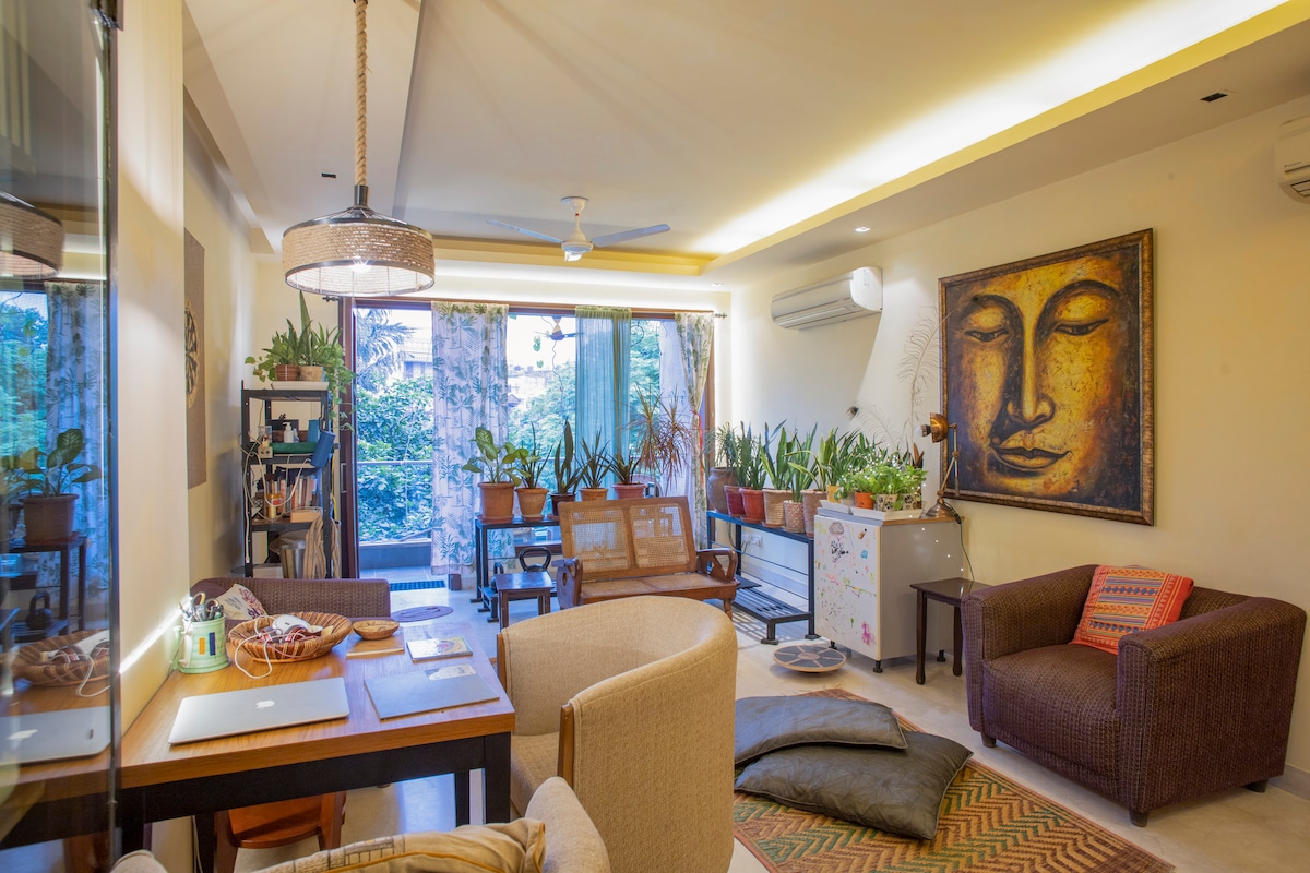 A two-bedroom, park-facing modern apartment with lots of natural light in one of the SAFEST residential neighbourhoods in south delhi - quiet, green and gated. There is 24-hour security and an elevator. A gym and a 40-acre forest are within walking distance. The metro is a 5-min walk and everywhere else is a 10-20 min drive. Best suited for independent, clean, and environmentally-conscious guests. Please read the whole listing before booking.