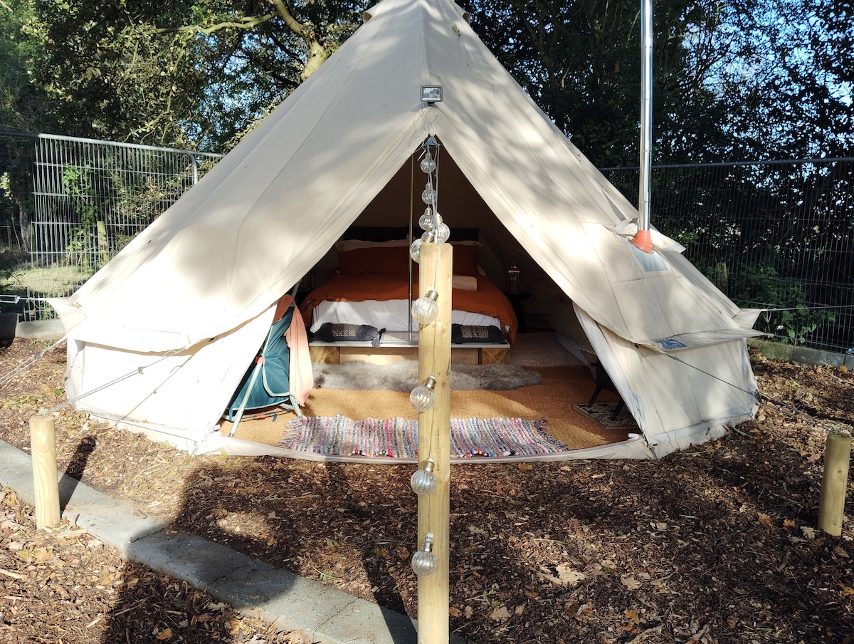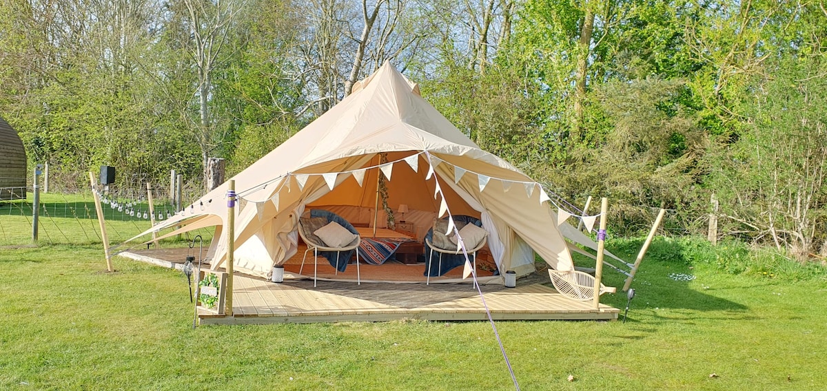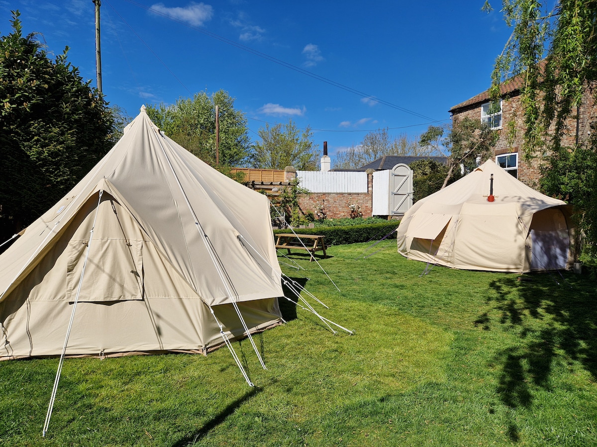 Daisy Lane Glamping ( Йорк ) із дров 'яною конфоркою. 5 наметів Meta Bell. 1, справжнє 4,6-місцеве ліжко. 2, лише односпальні дитячі ліжка.(Якщо дорослих більше 2, ви сплачуєте додатковий збір за дорослих у розмірі 25 фунтів стерлінгів за особу після прибуття) Тут є кози, кури та маленький пес Тед. Чудова зона для приготування їжі на вулиці під альтанкою. Ваш приватний куточок, місце для багаття, барбекю, пункт зарядки телефону. У нас є місце для глемпінгу поза мережею з компостними туалетами та чудовими гарячими душовими. 3 милі від центру Йорка на чудовому автобусному маршруті.