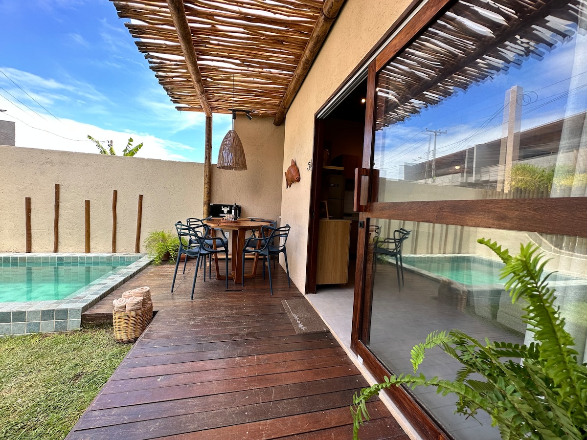 Це затишне та стильне помешкання за 200 метрів від пляжу, серед природної рослинності! Ми дружні доЛГБТК +, і, оскільки ми знаходимося на відстані від центру спільноти, ми насолоджуємося тишею, спокоєм і приватністю, але в п 'яти хвилинах від метушні та метушні! У люксі є гамак для відпочинку, ліжко розміру «queen-size», кухня, підготовлена з усім необхідним для приготування їжі . У ванній кімнаті є зарезервовані приміщення, які забезпечують вашу затишність. Розслабтеся в цьому помешканні!