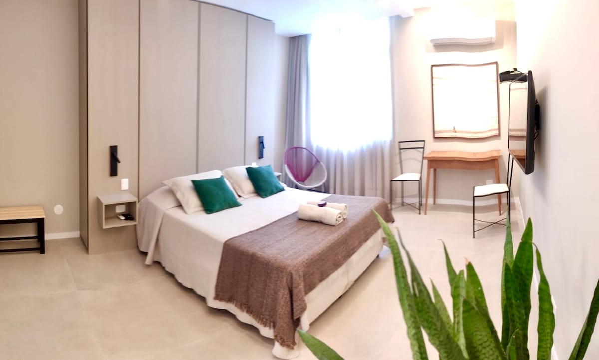 Charming and silent 25m2 studio, fully equipped, with high standard kitchen, bathroom and bedroom, and acoustic window with a 95% reduction of external noise. The studio is fully intelligent and responsive to voice commands (TV, sound, temperature and lighting). Located in the heart of Copacabana beach, our space is also just a few minutes walk from Ipanema beach, supermarkets, subway and a multitude of bars and restaurants, in the best of Rio style!