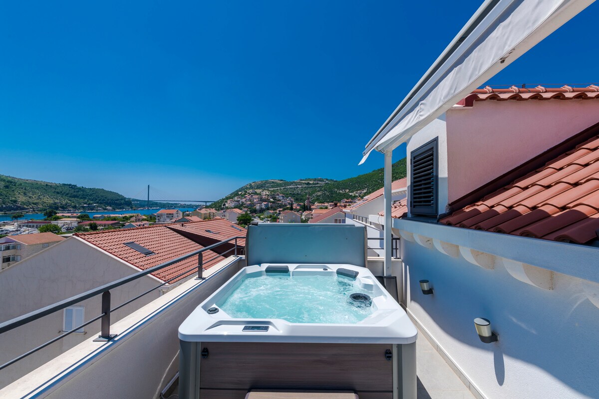 The 50 sqm Apartment Royal is situated in a beautiful villa on the Lapad peninsula, only 5 mins walk from the nearest beaches and 4km from the Old Town of Dubrovnik, main ferry port and bus terminal. The nearest bus stop is 50m away. It is completely new, with fully equipped kitchen, flat screen TV with Netflix, air-conditioning, Wi-Fi, romantic canopy bed and hydromassage bathtub. Enjoy the spectacular views, take a swim in the infinity swimming pool and sunbathe on the terrace with a sea view!