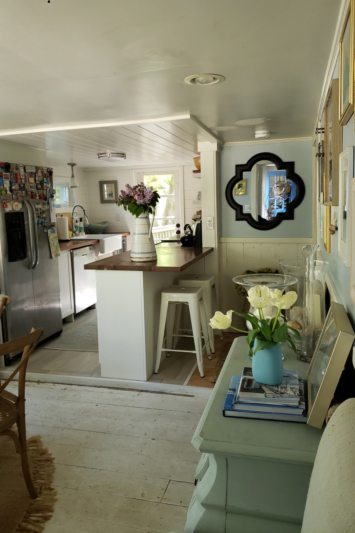 Нещодавно відремонтований і визнаний журналом New York Magazine одним із найкращих помешкань Airbnb, The Beach Cottage був спроектований і оформлений у сучасному органічному стилі з палітрою білих і нейтральних кольорів, щоб створити спокійний і затишний відпочинок. Відпочиньте у просторій, світлій і відкритій вітальні, де є скляна стіна для перебування в приміщенні/на відкритому повітрі з широким, безперервним видом на воду. Залишайтеся на території помешкання, щоб купатися, гуляти по пляжу, милуватися заходом сонця та смажити барбекю, або вирушайте на прогулянку, щоб насолодитися всім, що може запропонувати Норт-Форк.