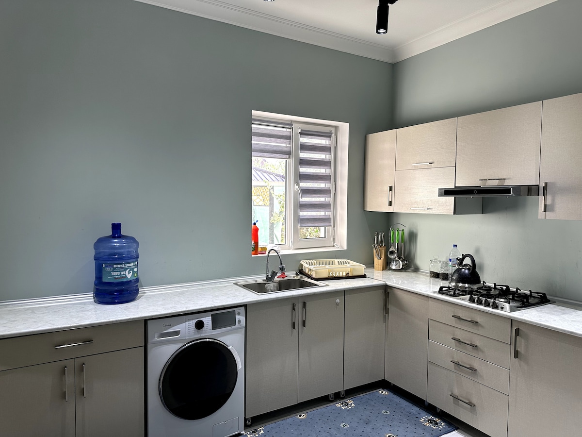 Ласкаво просимо до вашого приватного помешкання в Нукусі! Просторий приватний будинок площею 130 кв. м у Нукусі з 3 спальнями, 5 ліжками та 2 ванними кімнатами – ідеально підходить для 6 дорослих. Насолоджуйтеся повністю обладнаною кухнею, пральною машиною та затишною телевізійною зоною для відпочинку ввечері. Вийдіть на свій приватний садовий дворик, ідеальний для кави або відпочинку після дослідження міста. Тихе місце, але недалеко від центру та музею Савицького. Чудово підходить для сімей, друзів або ділових поїздок.