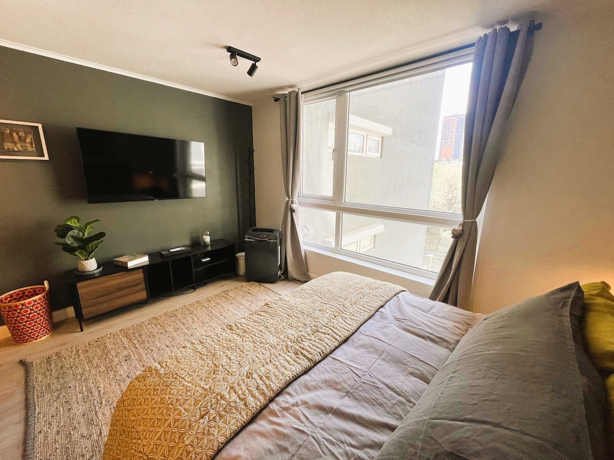 Modern, well-kept studio in Santiago, in a quiet area of La Florida, just 2 min 🚇 from Bellavista La Florida Metro and Mall Vespucio. Everything within walking distance: supermarkets, clinics, pharmacies, restaurants, and essential services. Ideal for couples, tourists, or work trips. Includes AC ❄️, high-speed WiFi 📶, equipped kitchen, 55” smart TV, modern bathroom with bidet + drying 🚿, work/dining table 💻, terrace with city + mountain views 🌃, and easy self check-in.