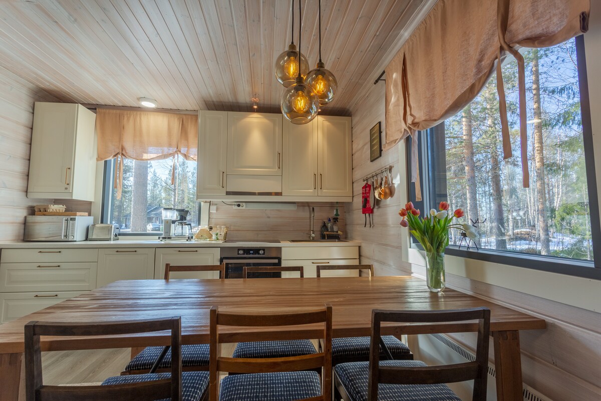 Levin Villa Repo is a modern and stylish log cabin with two bedrooms, completed in December 2023. It spans 80m² and is located in a peaceful setting, directly adjacent to forest and cross-country ski trails. The villa's large windows offer stunning panoramic views of the enchanting nature and forest landscapes. The villa includes a carport and ample parking space in close proximity. Additionally, there is a shared grill hut in the villa village. Free Wi-Fi is available.