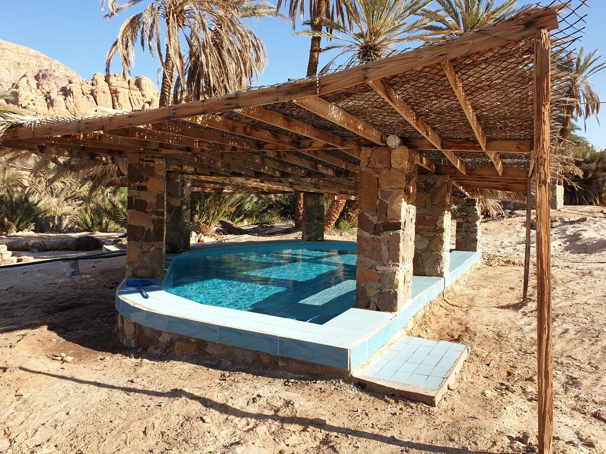 Для любителів дикої природи, які шукають активного відпочинку далеко від туристичних натовпів: приєднайтеся до Хамада та його сім 'ї в їхньому саду, щоб відпочити та відновити зв' язок із природою в приголомшливому оточенні Айн-Худри, історичного оазису високо в горах приблизно за 60 км від Дахаба. Територія навколо оазису - це рай для піших походів і походів, який можна досліджувати. Включено: простий кемпінг у саду або навколишній пустельній зоні, проста їжа, сезонні фрукти з саду. Є басейн.