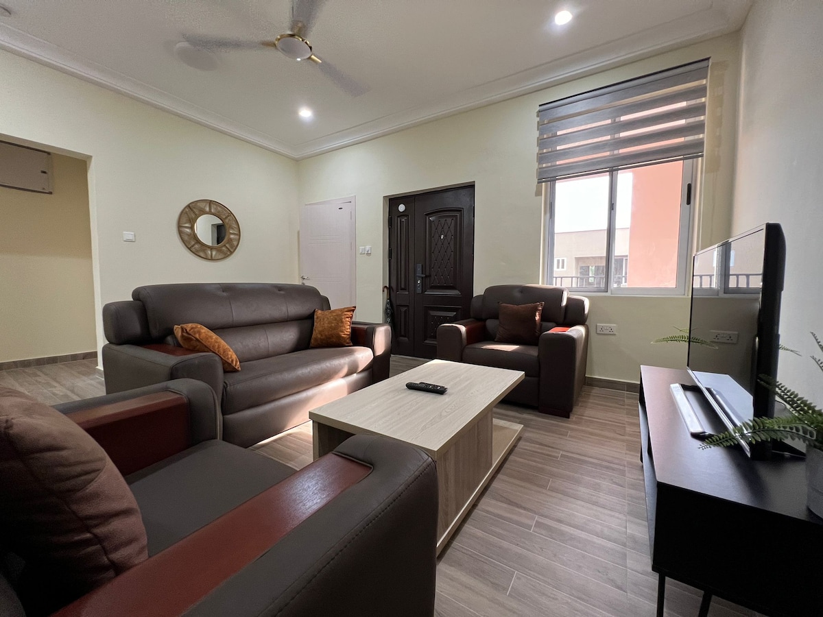 Welcome to this modern and stylish two-bedroom apartment that is perfect for individual and family stays. The apartment is conveniently situated from the Oyibi Police Station and Valley View University. Enjoy peace of mind with 24-hour security.