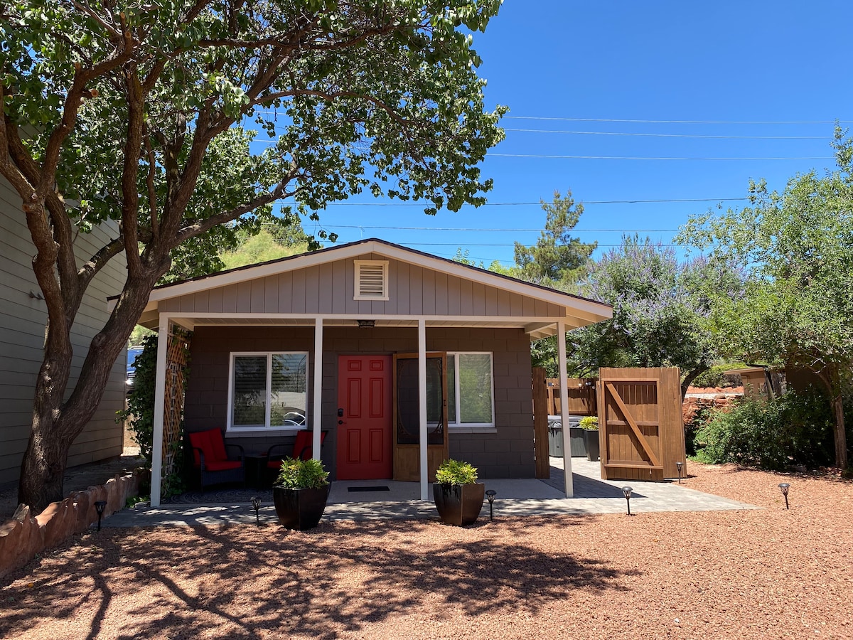 Відпочиньте в цьому романтичному стильному котеджі, розташованому в центрі Седони. Насолоджуйтеся приватним заднім двором з гідромасажною ванною, краєвидами та близькістю до центру міста, з його ресторанами, джип-турами та магазинами. Насолоджуйтеся двоспальним ліжком із підковдрою з бавовняної тканини JELLYMONI, яку змінюють після кожного перебування, бавовняною ковдрою влітку, бавовняною постільною білизною з щільністю 600 ниток у готельному стилі та розкішними м’якими білими бавовняними рушниками, а також добре обладнаною кухнею з безкоштовним паркуванням. У нас є високошвидкісний інтернет Starlink 100/10 Мбіт/с