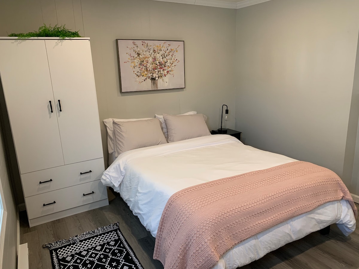 Ця квартира розташована в красивій місцевості. Для гостей доступна приватна парковка. На першому поверсі розташований вхід до коридору. Усередині ви матимете приватні двері, щоб увійти до своєї приватної квартири. Зовні ви можете насолоджуватися приватним патіо ззаду, доглянутим двором і дуже гарними садами. Плита відсутня, але ми пропонуємо зручності для простого приготування їжі та розігріву їжі. Ми також пропонуємо базовий континентальний сніданок з кашами та кавою.
