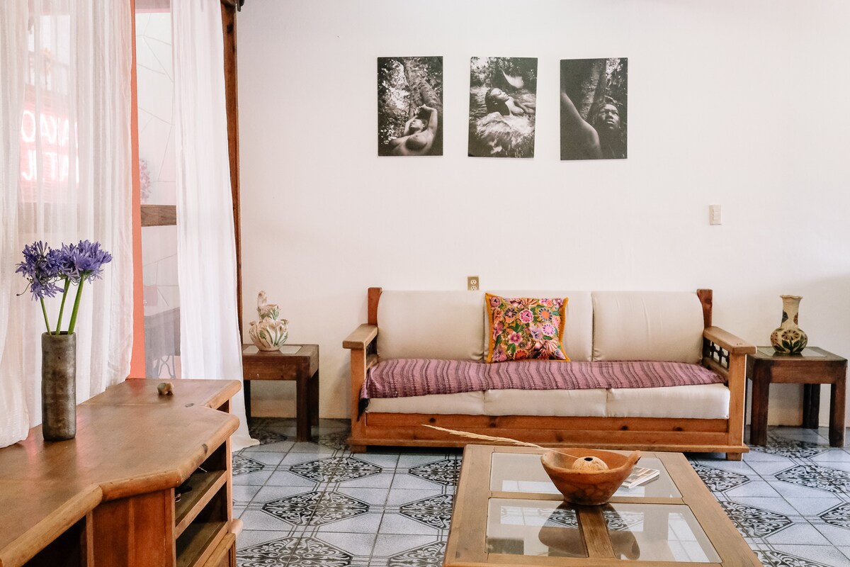 Гарна квартира на першому та другому поверхах гостьового будинку, спроектована співачкою Лілою Даунс і саксофоністом Полом Коеном. Вона має сучасну кухню та багато світла і розташована недалеко від центру міста Оахака на пагорбі з видом на місто. Він знаходиться внизу від іншого гостьового будинку (El Comalito: https://www.airbnb.com/h/comalito), де можуть розміститися 16 осіб. COMALITO НА ПЕРШОМУ ПОВЕРСІ ГОСТЯМ НЕ ДОЗВОЛЯЄТЬСЯ ВХОДИТИ В ПОМЕШКАННЯ НА ВЕРХНЬОМУ ПОВЕРСІ, ДО БАСЕЙНУ, СТУДІЇ АБО НА ВЕРХНЬОМУ ПОВЕРСІ ЗАГАЛОМ. ДЯКУЮ.