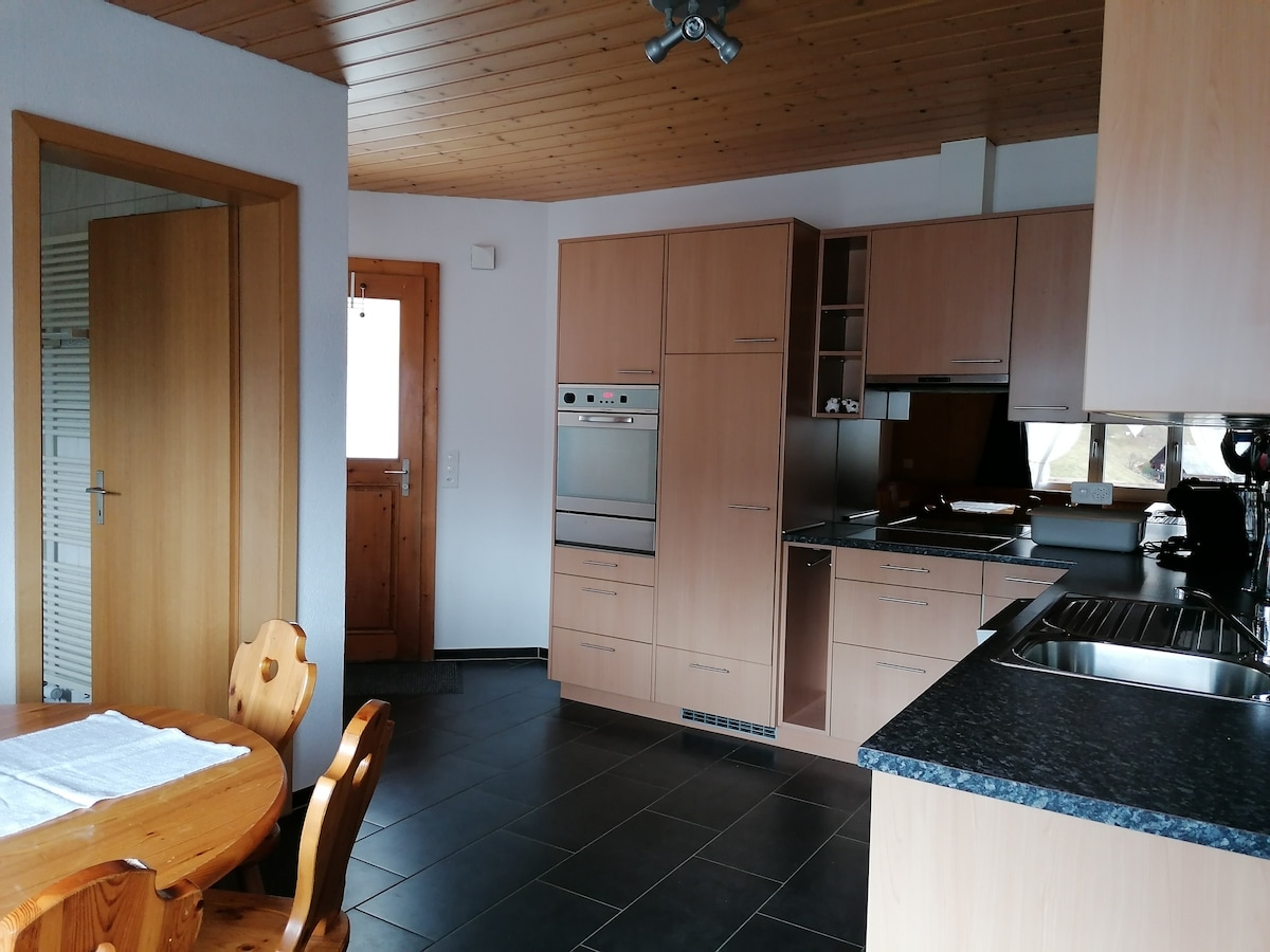 Unser kleiner Bauernhof im Emmental auf 1000 Höhe Meter, mit herrlicherm Blick auf die Berge, bietet ein 3 ½-Zimmer Ferienwohnung. Bei uns können Sie sich verweilen, erleben und abschalten. Hier können Kinder die Tiere beobachten, sich auf dem ganzen Hof bewegen und während der Stallzeit auch mithelfen; oder sie können von hier aus die schöne Natur mit Wandern und Bikerouten erleben. Die Wohnung bietet einen schönen Sitzplatz mit Holzcheminee und Spielplatz für die Kinder.