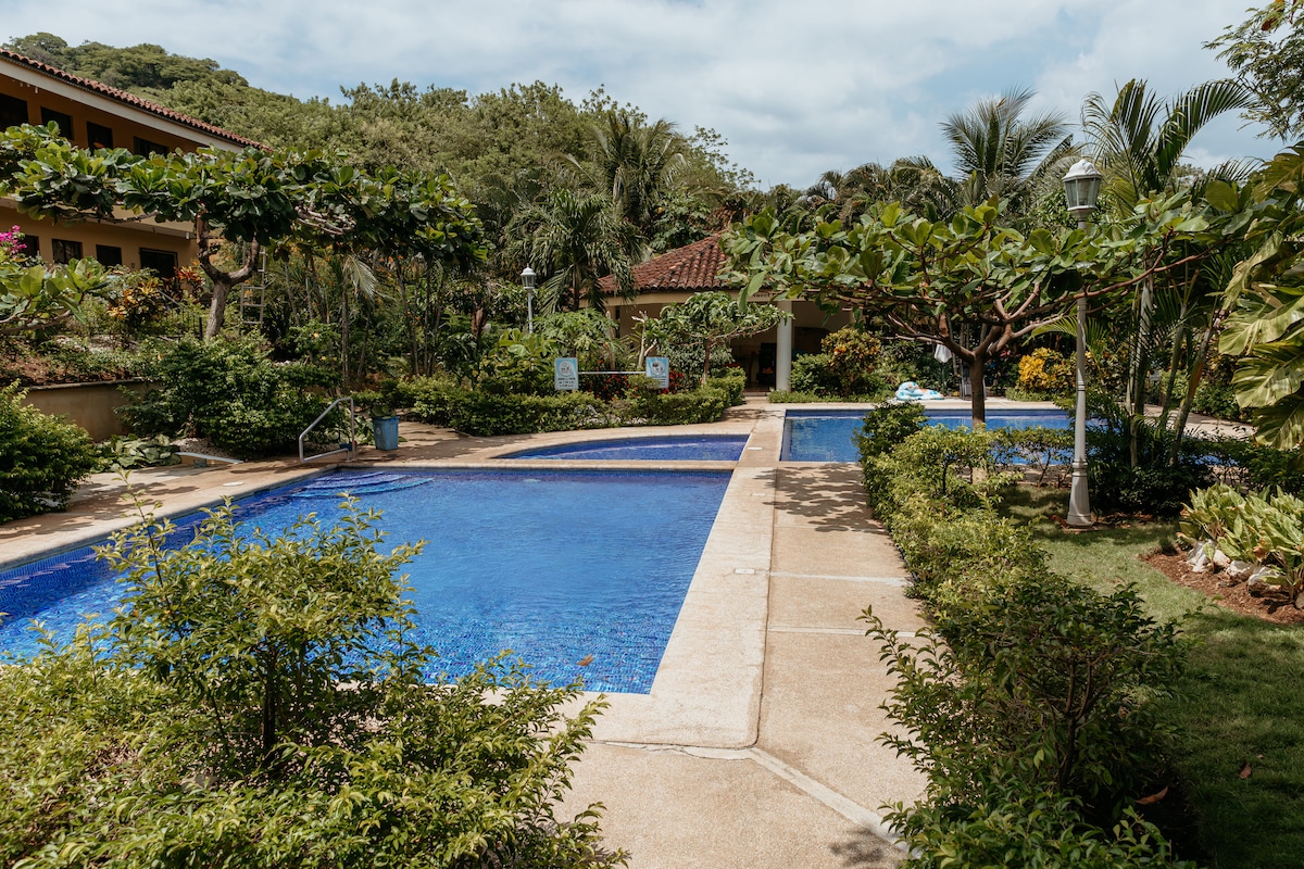 Насолоджуйтеся життям на пляжі, величними краєвидами та заходами сонця з власної приватної тераси, патіо або басейну! Цей чудовий кондомініум з 1 спальнею та 1 ванною кімнатою має ліжко розміру King size, окрему ванну кімнату, а кухня має великий острів і повністю обладнана всім необхідним посудом, щоб насолоджуватися їжею вдома. У вас буде простора вітальня та крита тераса, щоб насолоджуватися неймовірними краєвидами на океан, острови Каталіна, пристань для яхт Фламінго та затоку Потреро. Лише одна година до аеропорту Ліберії.