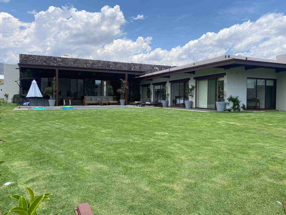 Casa elegante de concepto ecológico tipo cabaña. Ambiente tranquilo para diversión sana en un ambiente campirano. A 3 minutos del club de golf y a 10 minutos del pueblo mágico Malinalco. La energía solar calienta agua e ilumina varias zonas. La filtración diaria de agua hace que el jacuzzi sea sustentable sin tirar el agua. El asador funciona con gas LP o con carbón en un patio agradable y mesa grande para una buen convivio. No se aceptan mascotas por el momento