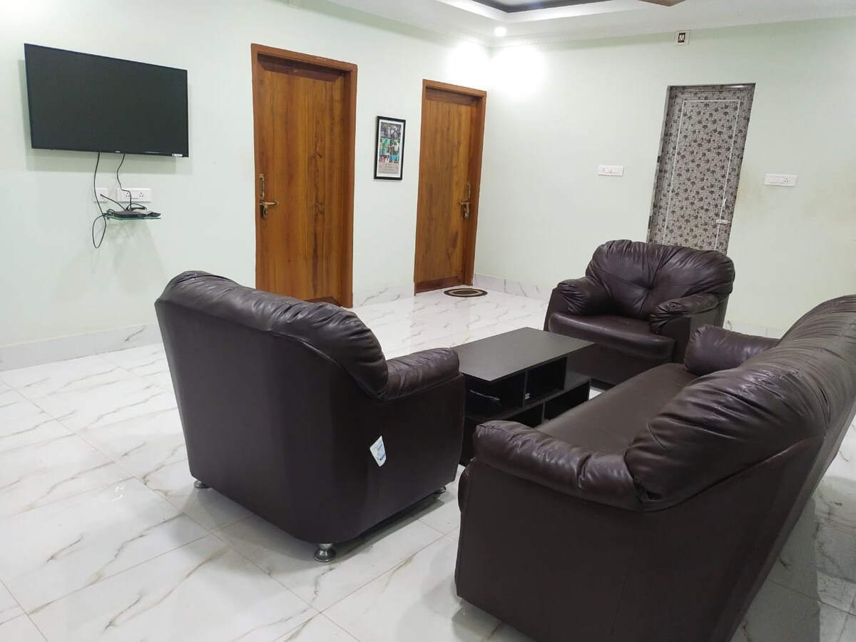 Spacious and comfortable 4BHK flat in the heart of Puri, ideal for families, groups, and pilgrims. Located just 1.5 km from Jagannath Temple and 2.5 km from Beach, with a temple view from the terrace. The home features a living area with sofa and TV, dining space, and a kitchen for self-cooking. 4 bedrooms are air-conditioned with attached washrooms and geyser. Includes Wi-Fi, washing machine, balcony, exterior security cameras, outdoor shower, and 24-hour electricity and water backup.