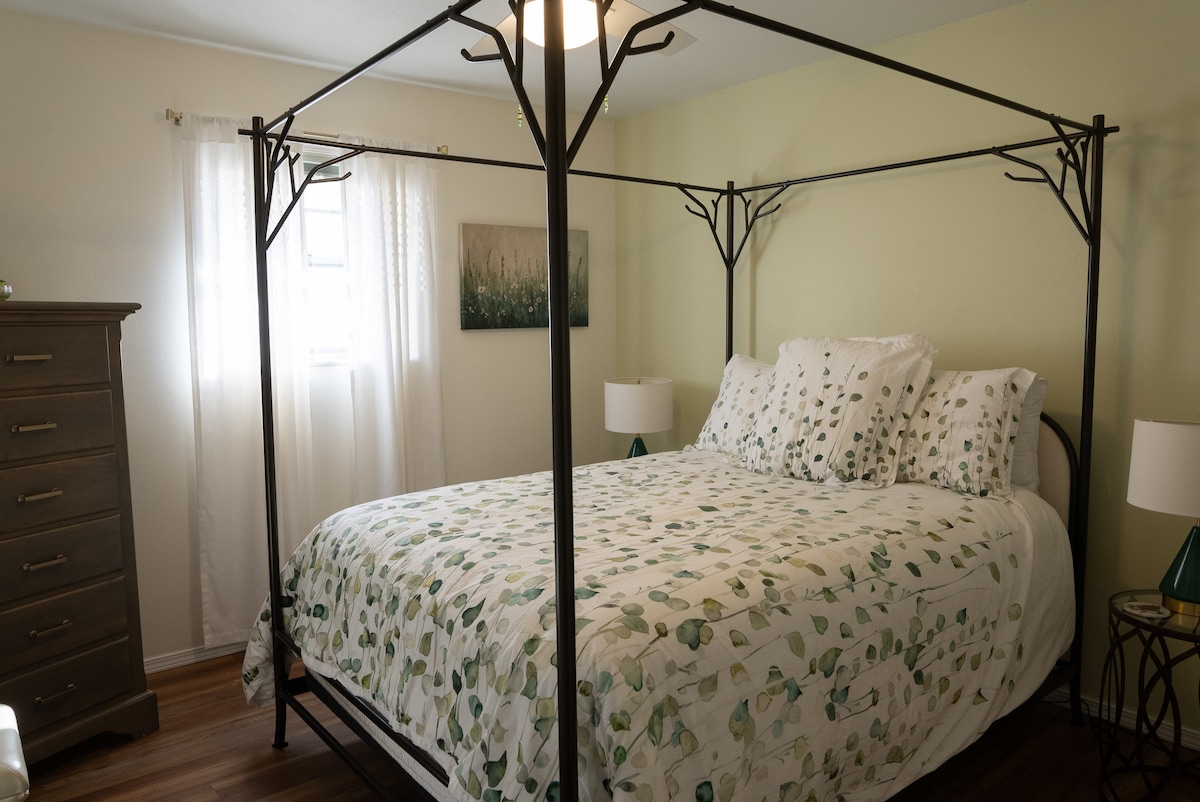 Happy House – це не просто місце для ночівлі, це барвистий, чарівний, чарівний і щасливий досвід! Веселий декор, мистецтво, квіти, гриби та міфічні істоти – все це робить усмішку яскравішою. Насолоджуйтеся приватністю на відкритому повітрі на огородженому задньому дворі XL, батуті, гойдалці, грилі та столі в патіо або насолоджуйтеся закусками, напоями, іграшками, настільними іграми та телевізором у приміщенні. Візьміть із собою великих або маленьких домашніх улюбленців, ми будемо раді прийняти їх усіх! Всього 5 хвилин до авіабази Тінкер, 15 хвилин до Paycom, Bricktown, зоопарку OKC.